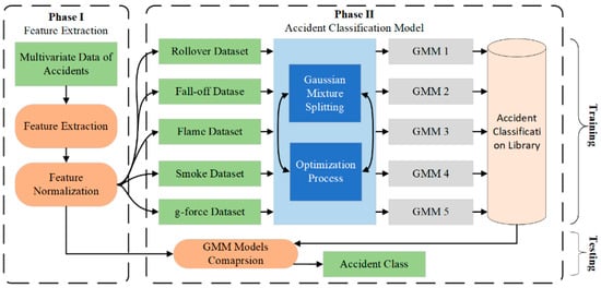 where is the covariance matrix for component and is a mean vector. The mixture weights fulfill the constraint that . The operation of GMM in an accident classification system consists of two phases as shown in Figure 5; (i) Feature extraction: the feature vector is derived from identified accident dataset using EM algorithm in GMM splitting and optimization block. (ii) Accident classification: in this phase, the trained models are assessed by feeding them with features of all unidentified accidents. Then, the probability of unidentified vector features related to a specific model is calculated. Accordingly, the model with high probability is considered as a potential accident class.