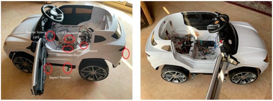 The hardware components of this work were Arduino mega (microcontroller), FSR 402 Force Sensitive (Force sensor), LM 393 IR Flame (Flame sensor), MQ2 Gas switch (Smoke sensor), ShockLog 298 (Impact sensor), 6AT8002–4AB00 Siemens (Accelerometer), GT-U7 car GPS navigation (GPS), and GSM 900, SIM 900 (GSM transmitter). A radio-controlled car was utilized to simulate real-life accident scenarios. The dimensions of the car were 40 cm height, 56 cm width and 101 cm length. The other specifications were 80 m operating distance and 50° maximum turning angle. The impact sensor was placed in the center of gravity in the car to ensure high accuracy readings as specified by National Highway Traffic Safety Administration (NHTSA) [28]. The positions of other sensors do not affect the accuracy of the readings. Figure 6 shows the hardware setup of the implementation.