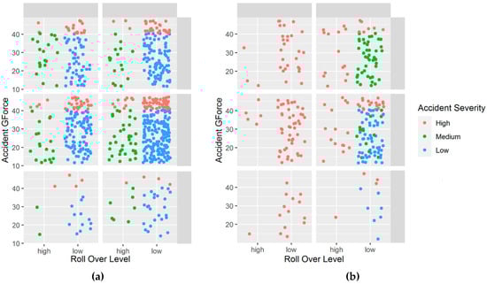 Figure 7 demonstrates the relation and the effect of each criterion on accident severity level. In Figure 7a, the severity level of accidents if there is no fire occurs depends on g-force and roll off levels. The severity level was high when the g-force was higher than 40 g whether fall off was high or low and regardless of the smoke level. For accident events with g-forces of less than 40 g, the accident severity level was classified as medium when the roll over level was high and it was classified as low when the roll over level was low. Figure 7b shows the effect of fire event on accident severity level, which depends on g-force and fall off levels. The accident severity level was high when the fall off level was high regardless of the values of g-force, roll over, and smoke levels. However, when the g-force level was lower than 40 g, the severity level was medium if the smoke level was high and low if the smoke level was medium or low.