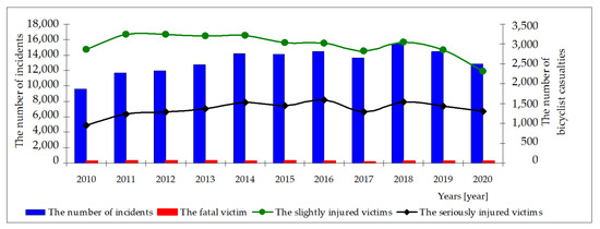 A traffic incident (recorded by the police) is a traffic accident or collision that occurs or begins on a public road, in a traffic zone or in a residential area, due to the movement of at least one vehicle. Road incidents are divided into road accidents and road collisions. In a road accident, there are casualties, while in a road collision there are only material losses. Over the past few years, several thousand road incidents involving bicyclists have been recorded in Poland every year (Figure 1). This number is likely to be significantly underestimated. First of all, because many typical collisions involving a motor vehicle and bicycle, or even less serious accidents, do not require the involvement of the Police. Drivers often prefer to cover the damage on the spot in cash, so as not to receive a penalty notice and lose the discount in the insurance for a damage-free driving car. Secondly, random verification shows that also many incidents in which the Police participated are not recorded in the nationwide database in which information on road incidents is collected, i.e., in The System of Records of Accidents and Collisions (SRAC) [3].