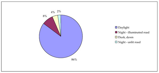 Analyzing the collected data set, it can be concluded that 1203 incidents (i.e., 86%) occurred during the day in daylight, 117 (8%) at night in conditions when the road was illuminated, 60 (4%) incidents occurred at dusk/dawn and the least, i.e., 30 (2%) incidents at night when the road was unlit (Figure 3). These results confirm the well-known regularity that in conditions of good visibility, daylight, well-lit road, drivers have excellent conditions to develop high speeds and tend to drive with a small margin of safety. On the other hand, unfavorable lighting and weather conditions contribute to increasing the attention of vehicle drivers, reducing vehicle speed, and driving with greater caution, which translates into the number of road incidents.