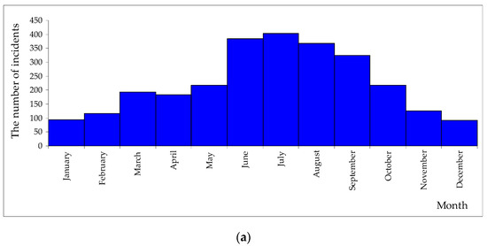 On the other hand, taking into account the variability of the number of incidents over time, the analysis covered the variability of the number of incidents per month, on individual days of the week, and the variability of the number of incidents in individual hours of the day. The analysis of the number of incidents in individual months of the year shows that the largest number of incidents took place in the summer-autumn period from June to September (Figure 4a). This period corresponds to the occurrence of warm weather in Polish conditions, conducive to the use of the bicycle both when traveling to and from work, as well as for tourist purposes. On the other hand, the distribution of the number of incidents on individual days of the week indicates that on individual working days there is a similar number of incidents with a visible spike on Saturdays and Sundays (Figure 4b).
