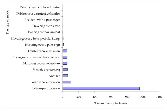 The number of individual types of road incidents involving bicyclists. Source: Own work based on data presented in SRAC database [3].