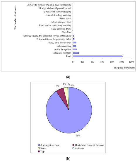 Figure 7 are shown the characteristics of the incidents for bicyclists depending on the place of the incident (Figure 7a) and road geometry (Figure 7b). When analyzing the place of the incident, it can be concluded that the most incidents took place in the area of the road (as much as 72%), followed by the sidewalk, footpath (9%), a ride for bicyclists (6%), zebra crossing (6%), road lane, bicycle look (4%). On the other hand, in terms of road geometry, most incidents took place on the straight section (90%) and then on the horizontal curve of the road (6%).