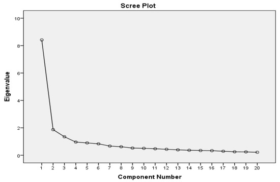 Table 2 shows the result of Bartlett’s test which is an approximation of the chi-square statistic. The value of Bartlett’s test was smaller than 5% (0.000), signifying that an exploratory analysis is good for identifying the factor model structure. The hypothesis assuming that the correlation matrix was known was rejected. Since the value of KMO at 0.914, shown in Table 2, is close to 1, the number of samples (here, the number of respondents) was adequate for the exploratory factor analysis.