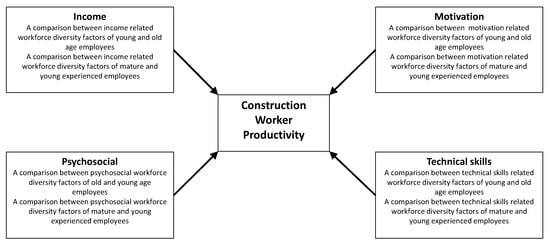 Therefore, a framework for learning the effective management of a diverse workforce and its influence on worker productivity in construction projects is still to be developed. A construction project may be a complicated body that may be planned as a system. However, like Harrison and Price [50] stressed, “people issues” are rather more problematic to unravel than technical problems within the short life of a project. Thus, for assuaging these issues, skills in managing workers are crucial. Therefore, sieving through the previous research and grasping theories, diversity has been carefully molded into the following intrinsic factors: income, motivation, psychosocial factors, and technical skills. The reason why these factors are needed to be studied for this research is that they emphasize the majority part of the difference, enhancements, changes, and processing of the environment that a worker experiences and goes through in their organization. As the JD–R model suggests, increasing work-related resources (autonomy, collaboration with colleagues, mentorship, skills advancement) and selecting staff with proactive personalities and a high level of motivation can increase work engagement and satisfactory employee performance outcomes [51]. The equity theory proposes that communication or status in an organization has an influence on the perceived fairness of pay. Work stresses have an effect on psychosocial strains, but the main pitcher to such strains is the demands that they have to contend with, but fair inputs (income, performance satisfaction, etc.) have a major impact on motivation and psychosocial factors [52]. They are further examined with respect to varied ages and experiences of employees in Pakistani construction contracting firms (CCFs) as shown in Figure 1.