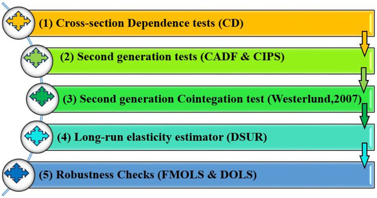 Furthermore, we assessed the robustness of our outcomes employing the fully modified ordinary least squares (FMOLS) and dynamic ordinary least squares (DOLS) regression techniques. FMOLS, according to Phillips and Hansen [48], is a stochastically unbiased and robust semi-parametric approach for removing correlation problems [49]. DOLS, on the other hand, includes lags and leads to predictor variables, keeping the error component orthogonal to stochastic regressor trends in the cointegrating model. By contending with disturbance factors, FMOLS and DOLS can aid with serial correlation and endogeneity difficulties in the equation [50]. Figure 1 represents the road map of econometric techniques of the current study.