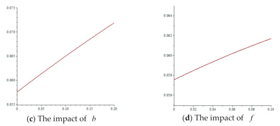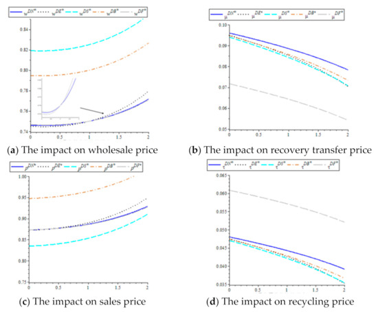 Proposition 7 illustrates that as consumer subsidy increases, the manufacturer will increase product ecodesign levels and the wholesale product price, but will reduce recycling transfer price for the third-party recycler, the retailer will increase the sales price, and the third-party recycler will reduce the recycling price. Proposition 7 also implies that under the government’s consumer subsidy policy, the retailer will erode part of consumers’ subsidy by raising sales price. Additionally, the consumer subsidy policy stimulates purchasers and indirectly motivates the manufacturer to design the products ecologically and ensures that the manufacturer has higher pricing for the eco-products. However, it is possible that the increased level of ecology reduces the cost of environmental pollution, leading to a lower recycling transfer price for the manufacturer, which in turn influences the third-party recycler to reduce the recycling price of discarded ecological products.