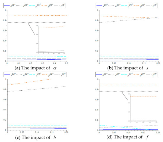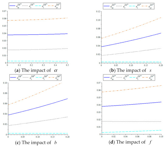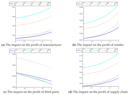 Proposition 4 shows that as the percentage of eco-input subsidy increases, the manufacturer and retailer will gain more profit, but the third-party recycler will lose profit. In other words, under the demand-oriented product ecodesign strategy, government subsidy for the manufacturer’s eco-inputs benefit himself and the retailer, but disadvantage the third-party recycler.