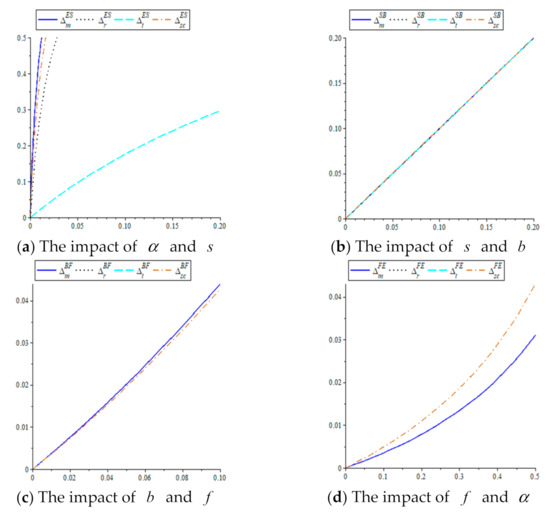 Proposition 3 illustrates that as the percentage of government eco-input subsidies to the manufacturer increases, the manufacturer will increase the eco-level of product, but will reduce the recycling transfer price and the third-party recycler’s recycling price will also decrease. This implies that under a demand-oriented product ecodesign strategy, a higher percentage of eco-input subsidy, while providing incentives for the manufacturer to invest in a higher level of product, may also reduce the incentives for the manufacturer and the third-party recycler to recycle waste eco-products. Proposition 3 also illustrates the effect of government eco-input subsidy policy on the manufacturer’s wholesale price and retailer’s sales price in relation to demand- and environment-oriented product ecodesign strategy. If the manufacturer’s ecodesign is overly consumer-oriented, the manufacturer’s wholesale price and retailer’s selling price will increase as the percentage of government eco-input subsidy to the manufacturer increases; if the manufacturer’s ecodesign is overly environment-oriented, the manufacturer’s wholesale price and retailer’s sales price will decrease as the percentage of government eco-input subsidy to the manufacturer increases. More specifically, if the manufacturer’s ecodesign slightly favors the consumer side, the manufacturer’s wholesale price will decrease but the retailer’s selling price will increase as the government subsidizes the manufacturer’s eco-input ratio; if the ecodesign slightly favors the environmental side, both the manufacturer’s wholesale price and the retailer’s selling price will decrease as the government subsidizes the manufacturer’s eco-input ratio.