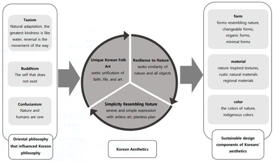 Figure 4 shows the oriental philosophy that influences Korean aesthetics and sustainable design through Korean aesthetics. Oriental philosophy that influences Korean aesthetics, including Taoism, Buddhism, and Confucianism, is also in contact with the concept of sustainability. This can be summarized as characteristics of Korean aesthetics including unique Korean folk art, resilience to nature, and simplicity resembling nature.