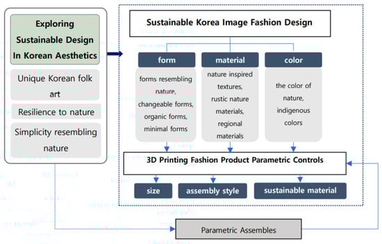 Various attempts are being made to develop a sustainable design process that changes with the development of digital technology. While the popularity of sustainability is affecting the fashion industry, users are dissatisfied with the level of sustainable design currently available. Therefore, this study proposed an objective process by creating an algorithm that increases the emotional attachment of users by incorporating a sustainable Korean aesthetic into the design process created by the designer’s intuition. To find a creative expression method for sustainable design, the direction and relevance of sustainability were explored via Korean aesthetics. With an adaptive thinking that considers nature and humans together, the Korean aesthetic sense of living in harmony with the environment exhibits many elements of current trends in sustainable development. This has had an impact on Korean life in general, and has helped to solve the problem of creative elements of Korean design.