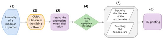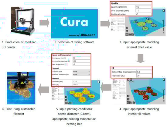 The first step was the assembly of a modular 3D printer. Sustainable 3D printing filaments are not yet widely used, and compatibility with existing 3D printers is low. Hence, a modular 3D printer was developed. Exploration of a slicing program that can insert an optimal output value depending on the filament substance was required. The narrow nozzle of the manufactured 3D printer clogged when the wooden substance combined with PLA during printing, implying a need to develop a modular 3D printer using open-source 3D printer data. The nozzle of manufactured 3D printers is normally 0.4 mm thick. The nozzle becomes damaged when using a foreign filament, after which there is no guarantee of quality. This study used a 0.6 mm nozzle instead. The newly assembled printer required tuning of the output data for normal operation. In the second step, the slicing software was explored. To 3D print the final digital data, CURA: (version 15.04.6, Ultimaker, Utrecht, The Netherlands) was chosen, as it ensures that the form has strong durability even with a minimal amount of 3D data. CURA also helps the 3D printer use the proper number of filaments without waste. The third step consists of setting the appropriate model shell value for product stabilization, post-printing. In the fourth step, the appropriate infill value was set to maintain a stable form with minimal filament consumption. The fifth step involved inputting the diameter of the nozzle value and selecting a temperature suitable for the filament type. To prevent contraction caused by a temperature difference during the printing process, the bed temperature was heightened. In the sixth step, the researchers printed from the 3D printer using the sustainable filament.