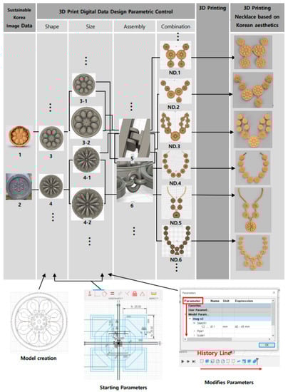 The sustainable product design development process is summarized in Figure 5, which was developed by the researchers using the parametric methodology concept based on Figure 5. This process explored sustainable design in Korean aesthetics and developed it into a knowledge base, with parametric components related to product size and material established. In this study, a necklace was selected as the type of fashion product. The reason is that various design changes are possible by manipulating the various pendant shapes and assembly styles that designers create through modeling data. Designers can reflect user preferences and tastes when it comes to parametric control of pendant size and assembly style.