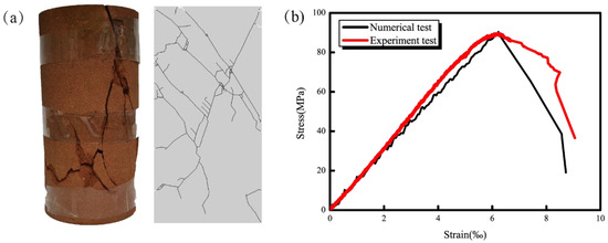 Uniaxial compression simulation experiment (a) comparison between simulation and laboratory experiment; (b) stress-strain curve.
