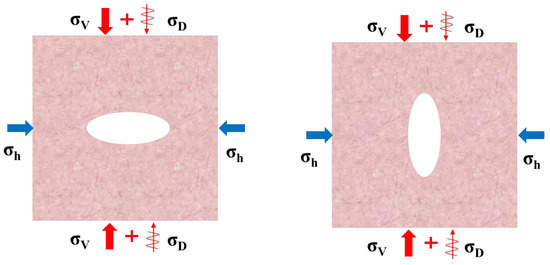 - Numerical simulation tests confirm that during the loading process, the left and right sides of the elliptical cavity were under a compressive stress, while the upper and lower sides of the cavity experienced tensile stress. The compressive stress value was significantly larger than the tensile stress. With the increase in axis ratio, the pressure area of the samples whose disturbance direction was parallel to the short axis of the ellipse decreased, while the pressure area of the sample whose disturbance direction was perpendicular to the short axis of the ellipse increased and the pressure area was larger.