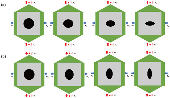 Figure 4 displays the numerical simulation model of this article. σh is the horizontal confining pressure, σv is the gravity stress, and σD is the disturbance load. The simulation selects a stress level of 500 m, where σh is 10.2 MPa, σv is 13.6 MPa, and σD is the slope disturbance loading method. The long axis of the ellipse is a and the short axis is b. According to the positional relationship between the disturbance direction and the short axis of the ellipse, two test types were set, namely, the disturbance direction is parallel and perpendicular to the short axis of the ellipse. The size of the sample was 110 × 110 mm with an oval cavity in the middle.