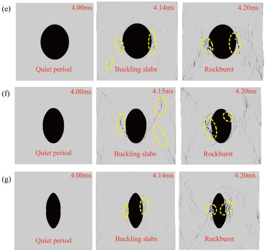 Figure 7 shows the typical damage phenomena in simulations with different axis ratios. The simulation tests with different axis ratios underwent the same process during loading, primarily including the quiet period, slab cracking period, and the rockburst period. Using the H-50 sample for illustration, when the sample was loaded to the initial stress level, the stress level was relatively low, the sample was in a relatively stable state, and no prominent damage was observed. At this time, the sample was in a quiet period. In this process, the sample was compressed and deformed, and a part of the energy was stored. However, the energy did not exceed the energy required for the destruction of the sample. With the application of the disturbance load, the load on the sample exceeded the load required for its failure and prominent cracks were produced on the left and right sides of the sample. As the load was enhanced, the length and number of cracks gradually increased, but the cavern did not produce large deformation and failure, and the sample was in a slab cracking period. With the continuous application of the disturbance load, a fragment on the left side of the cavern was ejected at a certain speed and a large piece of fragment was separated from the right side of the cave. Simultaneously, cracks became more prominent on the left and right sides, away from the cavern. The sample at this time was already in a severely damaged stage, i.e., it had entered the rockburst period.