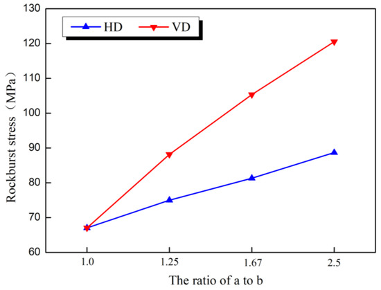 Figure 9 shows the relationship between the peak stress and axis ratios as per Section 3. With the increase in axis ratios, the peak stress level in the numerical simulation displayed an approximately linear increase, i.e., the larger the axis ratio, the higher the peak stress. Under the same axis ratio conditions, the peak strength value of the VD sample was higher, indicating that the load level was higher. These results show that the sample with the disturbance direction perpendicular to the short axis of the ellipse can clearly increase the bearing capacity of the cavern structure and slow the damage of the rockburst.