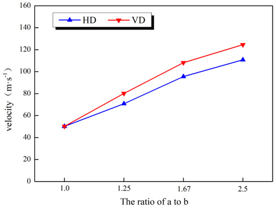 According to the results of numerical simulation, maximum ejection velocity of the simulated samples with different axis ratios were extracted. Figure 10 shows the relationship between maximum ejection velocity of the numerical simulations and axis ratios. With the rise in axis ratio, the maximum ejection speed was also increased. Under the same axis ratio, maximum ejection velocity of the VD sample was higher than the HD sample. As per Section 4.2, the stress on the sample was greater when the disturbance direction was perpendicular to the short axis of the ellipse. Therefore, the larger the accumulated energy, the greater the energy released during the disturbance process, and the higher the velocity generated.