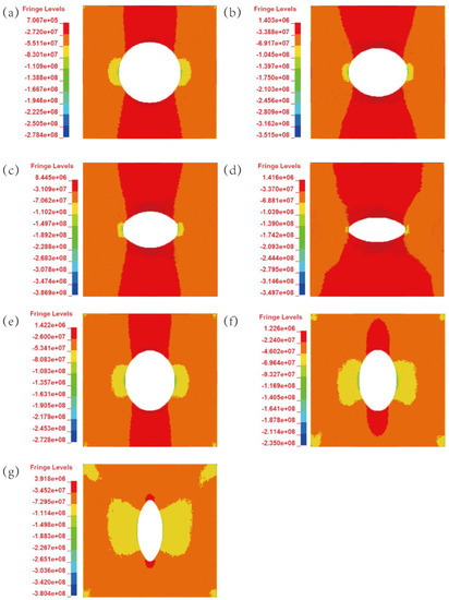 Figure 11 shows the stress nephogram of samples with different axis ratios. The selected moment was 0.8 times that of the peak stress. All the samples displayed the same characteristics on the stress nephogram. There were areas of compressive stress on the left and right sides of the cavern, while the tensile stress acted on the upper and lower sides of the cavern. The compressive stress value was significantly higher than the tensile stress. Owing to the compressive stress, the damage range of the elliptical cavern was on the left and right sides of the cavern. For HD samples, with the rise in axis ratios, the compressive stress area on the left and right sides of the cavern decreased, while the tensile stress area of the upper and lower cavern increased. For VD specimens, the change in trend was opposite. As the axis ratios increased, the area of compressive stress amplified, while the area of tensile stress was reduced.
