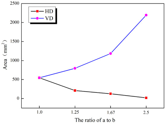 According to the stress nephogram, the area of the compression zone was extracted using an image processing software, and the relationship curve between the compression zone area and the axis ratios was drawn (see Figure 12). With the rise in ratio of the length to short axis, the compression area of the HD sample decreased, while the compression area of the VD sample increased.