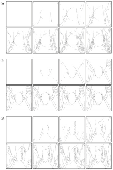 In the process of numerical simulations, with the vertical disturbance load, the generation and propagation of cracks occurred. The presence of cracks signifies that the sample has been damaged, and the number of cracks reflect the damage degree of the sample. To observe the development process of cracks more clearly, the images of the sample were processed into a binary image containing only black and white using image processing software, and the cracks were represented in black. Figure 13 shows the crack development process of the numerical simulation specimens with different axis ratios. With the disturbance load, the cracks increased. The crack evolution diagram reflects the entire failure process of the sample, and also shows the failure location.