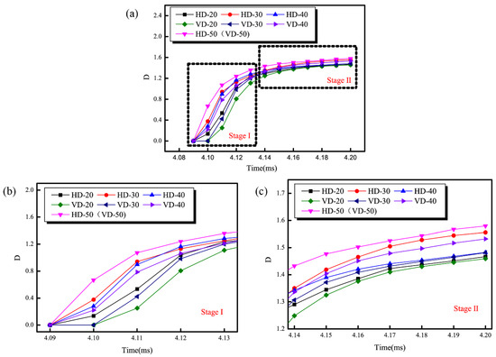 Figure 14b,c presents the enlarged view of stage I and stage II. At the same moment, the sample of HD-50 (VD-50) was at the top, and the order from top to bottom was HD-30, HD-40, VD-40, VD-30, HD-20, and VD-20. As the axis ratio increased, the value of the fractal dimension decreased. A small value of fractal dimension indicates a low degree of damage. These results demonstrate that during the disturbance process, the greater the axis ratio of the cavern, the more difficult it was to produce rockbursts. Compared with the circular caverns, it was more difficult for rockbursts in the elliptical caverns. Under the same conditions, the fractal dimension of HD samples was higher than that of VD samples. The samples whose disturbance direction was a short axis of the ellipse were more difficult to damage. As per the analysis of fractal characteristics of the crack image, for a fixed axis ratio, the cavity structure was safest when the disturbance direction was perpendicular to the short axis of the ellipse and the damage was lowest. This work can provide a reference for an engineering design.