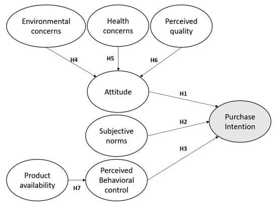 Consequently, various studies link health consciousness and perceptions with the intention to purchase organic food, suggesting that consumers who are more concerned about their health have a more favorable attitude towards organic food [1,7,16,19,37,44]. In line with this, the fifth research hypothesis is defined as follows: