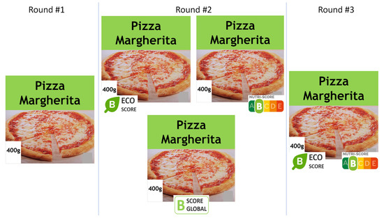 The main objective of this study was to measure the purchase intents for pizzas and how these choices were swayed by environmental and nutritional scores varying across participants (as explained below). A picture of the same pizza was shown at rounds #1, #2 and #3 focusing on these purchase intents (see Appendix B). At each round, we presented the same simplified packets of the most consumed pizza, namely the Margherita pizza (see Figure 1). We did not mention any brand or specific label, for keeping a common and generic aspect of the product.