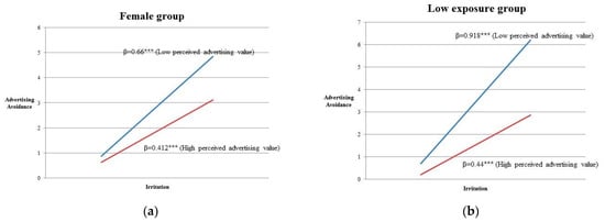 Advertising value is a measure of advertising effectiveness. In prior studies, advertising value was perceived as a predictor of attitudes toward advertising [,,]. Edwards et al. [] stated that when advertisements provide value, they become less interruptive and less irritating. Certain demographic characteristics, such as gender [,,,,], frequency of exposure to advertising [,,], and media usage time [], affect the receptivity to, effectiveness of, and attitudes toward advertising. Demographic characteristics have been used to assess the moderating effects of perceived advertising value on perceived intrusiveness and irritation, which influence advertising avoidance []. Elucidating how perceived advertising value affects advertising avoidance in terms of demographic characteristics would provide important information to help mitigate advertising avoidance.
