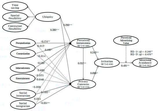 Privacy concerns are defined as “SNS users’ apprehension about the loss or abuse of their private information” [,,,]. In a study of Internet information privacy, specifically based on “concern for information privacy” (CFIP), the dimensions of “Internet-user information privacy concern” (IUIPC) were developed as “collection, awareness, and control.” Collection refers to the degree to which a person is concerned about the volume of individual-specific data processed by others in terms of the benefits received, awareness relates to information transparency and the disclosure of specific information, and control indicates the freedom to either accept or reject the process or decision outcome []. A perception of an invasion of privacy by advertisements in mobile social media, which may result from the loss of benefits received from advertising, information transparency and the disclosure of specific information, and the control of personal information, leads to specific apprehensions. In other words, the invasiveness or intrusiveness of advertising may cause privacy concerns by users of mobile social media. Privacy concerns in the form of consumers’ apprehension about their information loss and abuse may lead to negative outcomes. Prior studies focused on advertising have empirically confirmed that privacy concerns are significantly associated with attitudes towards advertising [,,,]. We propose that privacy concerns induced by advertising significantly increase irritation, a negative attitude toward advertising. Hence, we propose the following hypotheses: