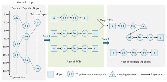 | Input: A set of trips Output: A complete schedule Step 1: Formulate a set of TCSs by Algorithm 3 Step 2: Merge the trip chain segments by Algorithm 6 |