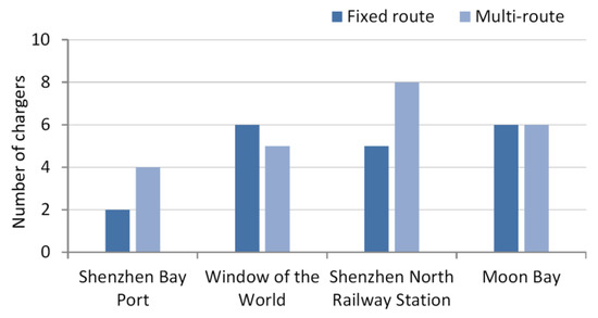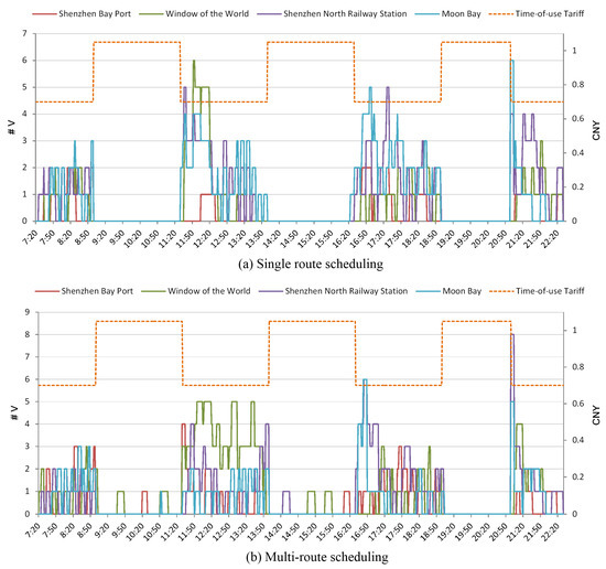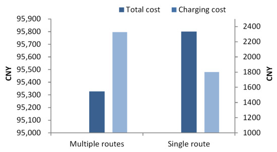 - Compared with single-route operation mode, multi-route operation mode can save the number of vehicles utilized at the expense of a higher charging cost. As such, the optimal schedule with the lowest total operational cost requires a balance between the vehicle usage cost and charging cost.