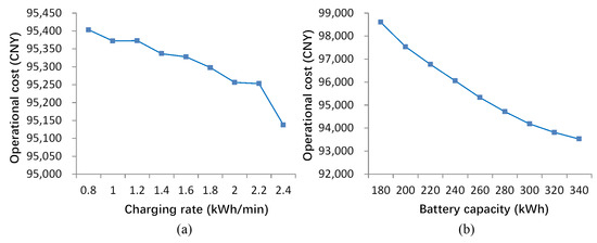 - With a certain number of scheduled trips, increasing the battery capacity can reduce the operational cost; however, the effect of the reduction tends to decrease. Increasing the charging rate can reduce the operational cost.