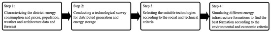 In order to achieve the research goal for building a comprehensive model for urban energy infrastructure design, a four-step methodology was suggested based on a similar concept suggested in [11]. However, in order to account for all four aspects of sustainability, the suggested model includes a combined qualitative and quantitative evaluation. The methodology is summarized in Figure 1. The first step of the methodology is characterization of the urban district. This includes gathering data regarding energy consumption history, population, architecture, energy policy, energy prices and weather history of the district and its area, and future energy consumption and weather estimations. The second step of the methodology is conducting a techno-logical survey on state-of-the-art commercial technologies for distributed generation (DG) and energy storage (ES). The third step is selecting technologies suitable for a given infrastructure according to social and technical criteria. Finally, the fourth step of the methodology involves selecting and using a design algorithm to simulate different energy infrastructure configurations and finding the best configuration according to the economic and environmental criteria. The simulations are based on the concept of microgrids which can switch between island mode, and connection to the national grid mode [11,14,16].
