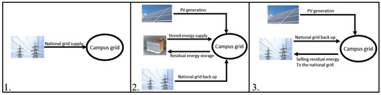 Simulated energy infrastructure configurations: (1) national grid supply only; (2) PV generation, battery storage and national grid back up; (3) PV generation with national grid back up and selling residual energy.