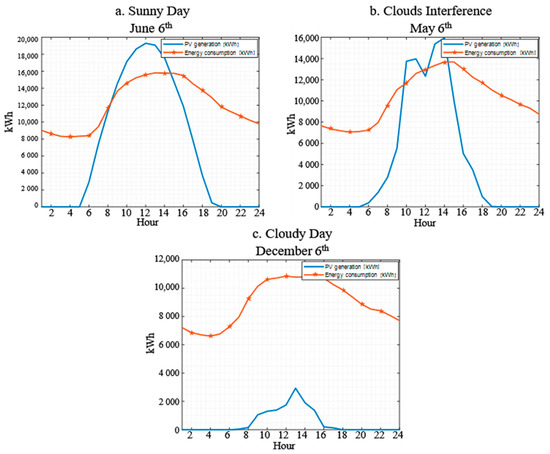Hourly PV generation simulations and hourly energy consumption for three different days: (a) sunny day, (b) some clouds interference, and (c) cloudy day.