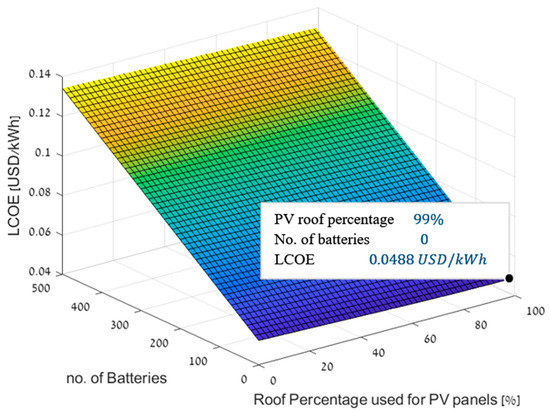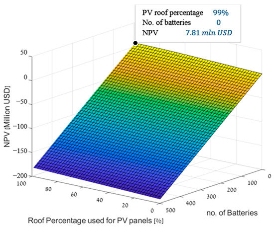 The LCOE for the basic configuration (configuration one) of buying all of the needed energy from the national grid, was 0.0521 USD/kWh. Furthermore, GHG emissions by configuration one were 0.2183 kgCO2/kWh. LCOE results for configuration two, which included PV generation inside campus and residual ES in lithium-ion batteries are presented in Figure 5. This includes different usage levels of PV modules and batteries, as the percentage of the campus roof area covered with PV module ranges between 0 and 99%, and the number of batteries ranges between 0 and 499. As depicted in Figure 5, the lowest LCOE of 0.0488 USD/kWh was received for covering 99% of the campus roof area with PV modules while using no batteries. This is not equivalent to configuration three, since the residual energy is not sold. Furthermore, the LCOE increases as the number of used batteries increases. This is also presented in terms of the NPV for cost savings for configuration two shown in Figure 6, where the highest savings of about 7.812 million USD over the life cycle of 20 years were received for covering 99% of the campus roof area with PV modules while using no batteries. In addition, the NPV decreases as the number of used batteries increases, reaching negative values. Negative NPV means that for the used energy infrastructure configuration, the campus will pay more than it would if it were to use the basic infrastructure configuration (configuration one). As seen from Figure 5 and Figure 6, the economic worthwhileness of this configuration peaks when no batteries are used, and decreases with increasing the number of batteries used. This outcome results from the synchronization between the PV generation and the campus energy consumption. This synchronization is characterized by small amount of PV generation residuals for charging the batteries, as most of the PV generated energy is consumed by the campus immediately and not stored. This small amount of PV generation residuals is insufficient to justify the high prices of the batteries. Nevertheless, these figures show that this configuration becomes more worthwhile with increasing the number of PV modules used (i.e., the campus roof area covered with PV modules).