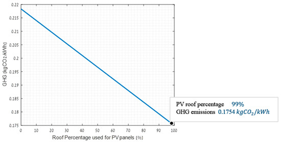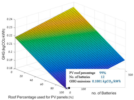 GHG emissions results for configuration two are presented in Figure 7. As can be seen in the figure, the lowest GHG emissions for configuration two were 0.1801 kgCOkgCO2/kWh/kWh, and were received for using 12 batteries and covering 99% of the campus roof area with PV modules. Moreover, the GHG emissions increased with increasing the number of batteries used. This is mainly due to the high rates of GHG emissions involved in the manufacturing of the lithium-ion batteries along with the synchronization between the PV generation and the campus energy consumption mentioned above. Nevertheless, the GHG emissions decreased as the PV cell area used increased.