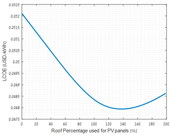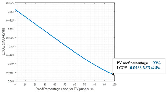 In conclusion, configuration three with PV coverage of 99% of the campus roof area was found both the best economically and environmentally, receiving both the lowest LCOE and the lowest associated GHG emissions. The total energy consumed by the campus over the life cycle of 20 years was 2.35 TWh. This makes the difference of 0.0005 USD/kWh between the minimum LCOE values of configurations two and three result in a difference of over 1 million USD in total costs between the two configurations over the life cycle. The IRR for configuration three with PV coverage of 99% of the campus roof area, was 15.08%, according to Equation (2). This calculation signifies the worthwhileness of using this configuration and the confidence level of the economic simulations, as it is bigger than the discount rate of 7% considered in the simulations.
