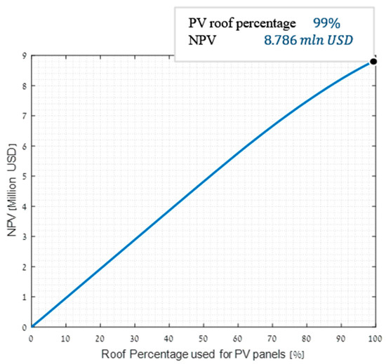 LCOE results for configuration three, which included PV generation inside campus and selling residual energy to the national grid are presented in Figure 8. The simulations included different usage levels of PV modules, expressed as the percentage of roof area of the campus, covered with PV modules. As presented from the figure, the LCOE decreased as the number of PV modules used increased. The lowest LCOE of 0.0483 USD/kWh was received for covering 99% of the roof area with PV modules. The same results can be seen in terms of the NPV for cost savings for configuration three presented in Figure 9, where the NPV increased as the number of PV modules used increased. The maximum NPV was 8.786 million USD and was received for covering 99% of the roof area with PV modules. Although Figure 8 shows that the LCOE for this configuration decreases monotonically with increasing percentage of roof covered with PV modules, this is not the case for PV cell area that exceeds the entire roof area of the campus. As seen from Figure 10, the LCOE for this configuration reaches a minimal value for using PV cell area that is equal to 138% of the campus roof area, and increases when increasing the PV cell area further. This outcome is important to prevent decision makers from having the notion that the more PV module used, the lower the costs. At 138% roof area covered with PV modules, all of the modules generate electricity that is consumed by the campus and meet the campus demand during generation hours. As such, in this point the PV generated electricity replaces entirely purchasing electricity from the national grid during high-rate hours, as presented in Appendix A. Beyond 138%, all electricity generated by additional PV modules is sold entirely to the national grid and is not consumed by the campus. Since the electricity selling price of 0.066 USD/kWh is much lower than electricity purchasing prices during high-rate hours which reach 0.257 USD/kWh, selling electricity is less economically worthwhile for the campus than consuming it. Hence, the LCOE increases for PV cell area exceeding 138% of the campus roof area, reducing costs savings for the campus. GHG emissions results for configurations three are presented in Figure 11, where the associated GHG emissions decreased as the number of PV modules used increased. This outcome is due to the relatively low emissions of PV modules manufacturing, compared to the emissions from fossil fuel generation as presented in Appendix A. In addition, residual PV generated electricity that is sold to the national grid replaces fossil fuel generated electricity supplied to it, contributing to GHG emissions reduction even further than the emissions associated with the energy consumed by the campus. The minimal GHG emissions were 0.1754 kgCO2/kWh and were received for covering 99% of the campus roof area with PV modules.