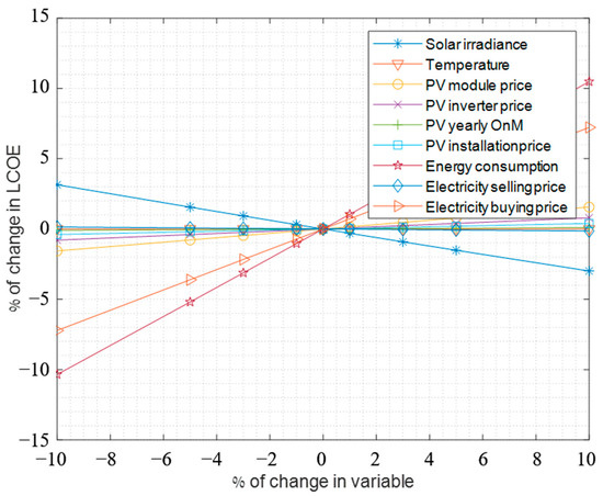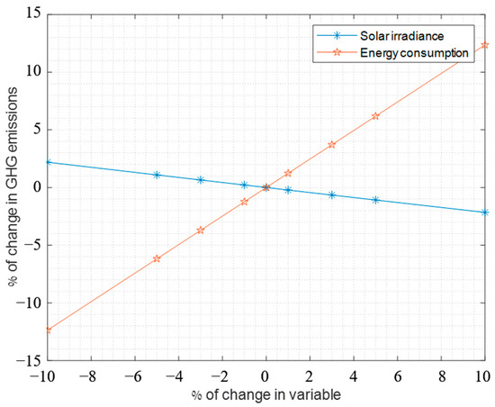 Lastly, a sensitivity analysis was performed in order to investigate the uncertainties concerning estimated variables in the simulations. The analysis was performed on configuration three with PV coverage of 99% of the campus roof area. Furthermore, the analysis included calculation of the effect of changes in estimated variables, on the LCOE and GHG emissions calculations. This was accomplished by performing the simulations several times, where each time one of the estimated values changed by a certain percentage. The results of the sensitivity analysis for the LCOE and GHG emissions are presented in Figure 12 and Figure 13, respectively. As presented in the sensitivity analysis, the estimation of energy consumption by the campus has the biggest effect on the LCOE. The second largest impact on the LCOE is from the estimation of electricity buying prices, and the third largest impact is from the estimation of solar irradiance. These effects on the LCOE are significant, since a change of 1% in the LCOE equals costs difference of about 1.1 million USD over the life cycle. The estimation of energy consumption by the campus had also had the biggest effect on the GHG emissions, as presented in Figure 13.