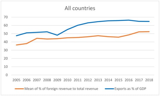 Mean of % of foreign revenue to total revenue and mean of exports as % of GDP. Source: World Bank.