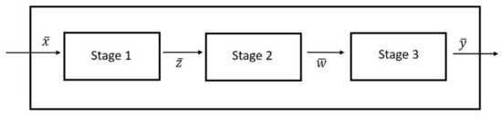 Constraints of Models (9) and (10) can be defined similarly to Model (8). Constraint (9a) represents the sum weighted outputs of stage 2, “w”, for all DMUs is less than or equal to 1. Constraint (9c) guarantees the sum weighted inputs of stage 2, “z”, “l”, and “d”, for all DMUs are equal to 1. Notably, “d” is the output of stage 3 that is returned to stage 2. Focusing on Model (10), constraint (10a) represents that the sum weighted outputs of stage 3, “d” and “y1”, for all DMUs is less than or equal to 1. Constraint (10c) indicates that the sum weighted inputs of stage 3, “w”, “y2”, and “p”, for all DMUs is equal to 1 similar to previous models. “y1” and “y2” is the undesirable and desirable outputs of stage 3, respectively. The main aim of Models (8), (9), and (10) is to select the efficient strategy for SSC network design (see Figure 2). The efficient strategy is a strategy with the highest efficiency score. The mentioned three models sought the maximum efficiency of stages 1 to 3, respectively. It can be said that the modification of the DEA model resulted in a linear model for efficiency evaluation, while the issue of selection was also considered. These models were formulated with the help of binary variables and introduced inequalities.