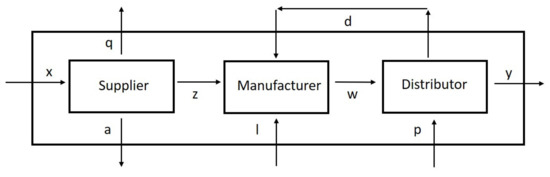 Considering the network depicted in Figure 2 with three stages, x indicates the input of the supplier with component. q and z are desirable outputs of this stage with and components, and a is the undesirable output with components. The manufacturer uses d, z, and l as its inputs, and produces w as the output. l, d, and w have , , and components, respectively. p enters distributor as inputs with components, and d leaves this stage as feedback to the manufacturer. Finally, y is the output the of distributor that is the output of the system. Notably, Figure 2 shows a three echelon SC, including supplier, manufacturer, and distributor. Since SCM includes the processes of supplying the materials, producing the products, until delivering that product to the customer, the SC network can also have a fourth component called the retailer. According to the case study investigated in this research, the distributor and the retailer are considered as one component at the end of the chain. Therefore, modeling was performed based on a three echelon SC.
