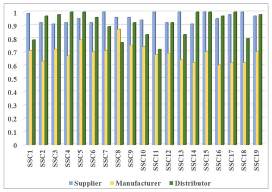Figure 3 illustrates the efficiency scores obtained for each stage with respect to the selected strategy for deigning each SSC. Based on this figure, suppliers in SSC7, SSC11, SSC15, and SSC18 had the maximum efficiency score (the value of 1). Regarding the manufacturers active in the studied SSCs, the manufacture of SSC8 with an efficiency score of 0.87 outperformed other manufactures. As shown in Figure 3, for most SCs, the efficiency of the manufacturer was lower than the efficiency scores of supplier and distributor. Notably, the values of efficiency scores obtained for the supplier and distributor were approximately equal in the studied SSCs. Distributers of SSC4, SSC5, SSC14, SSC15, and SSC18 showed the highest possible efficiency score in comparison with other ones.