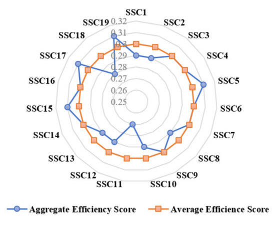 Based on Figure 4, it can be seen that four SSCs had an aggregate efficiency score more than the average score after performing their respective best strategies. Conversely, 17 SSCs showed the aggregate efficiency equal to the average value. However, these SSCs should follow the strategies proposed to design SSCs with an efficiency more than average to achieve maximum sustainability.