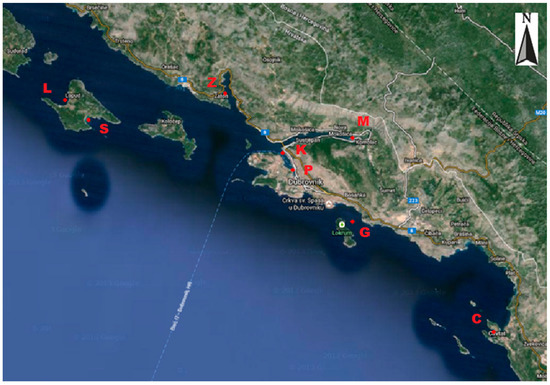 Sea sampling locations in the Dubrovnik aquatorium. (C, Cavtat waterfront; G, Dubrovnik old town anchorage; K, Gruž harbour; L, Lopud; M, ACI marina Dubrovnik; P, Gruž waterfront; S, Šunj; Z, Zaton).