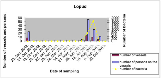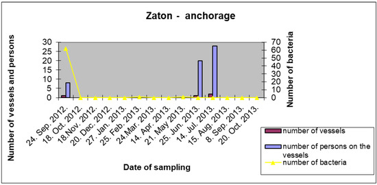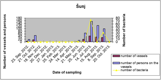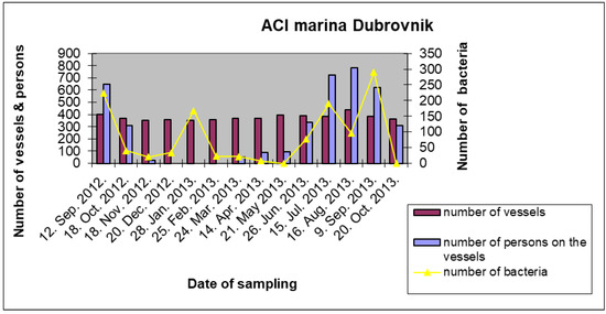 Table 3 shows that from November to May, no moored vessels were present; as a result, we found no bacteria in the sea samples. Bacteria in the samples significantly increase when more yachts were moored, i.e., when there were more people present. A graphical representation of the results in Table 3 is provided in Figure 5.
